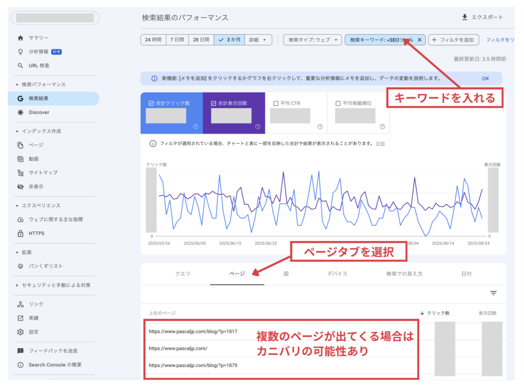 ページタブに切り替え、カニバリを特定したいキーワードを入力してページを絞り込みます。複数のURLが表示された場合は、カニバリが起きている可能性があります。