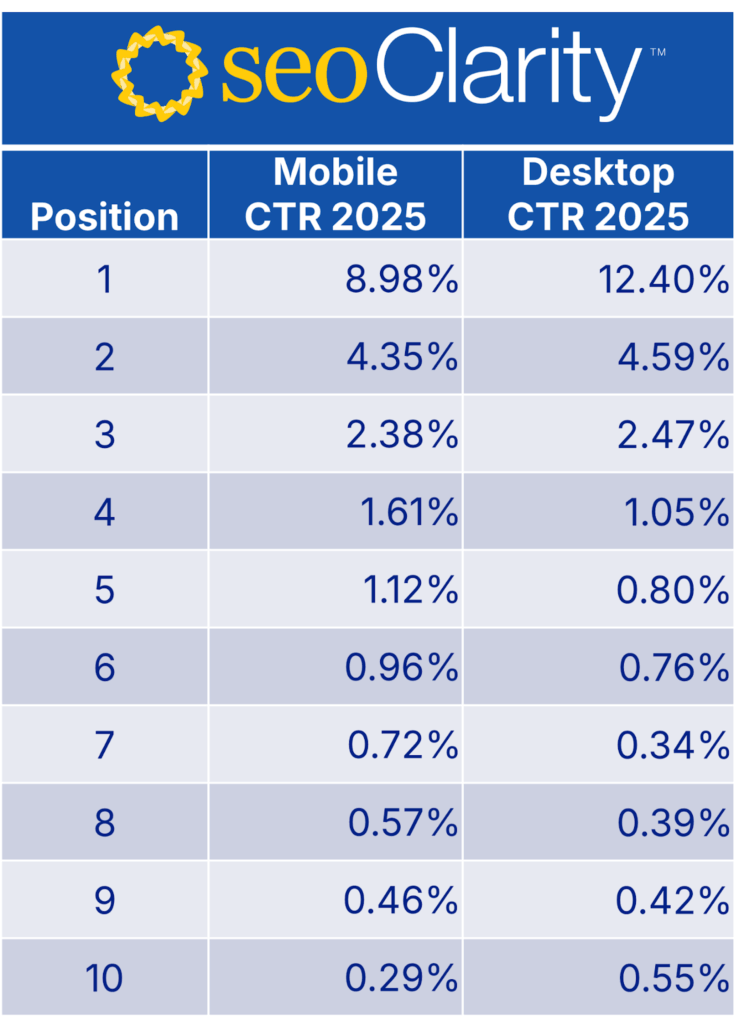 seoClarity のモバイルとデスクトップのクリック率調査によると、デスクトップの場合、1位のCTRは12.40%、2位は4.59%、3位は2.47%となっています。(下の画像参照)