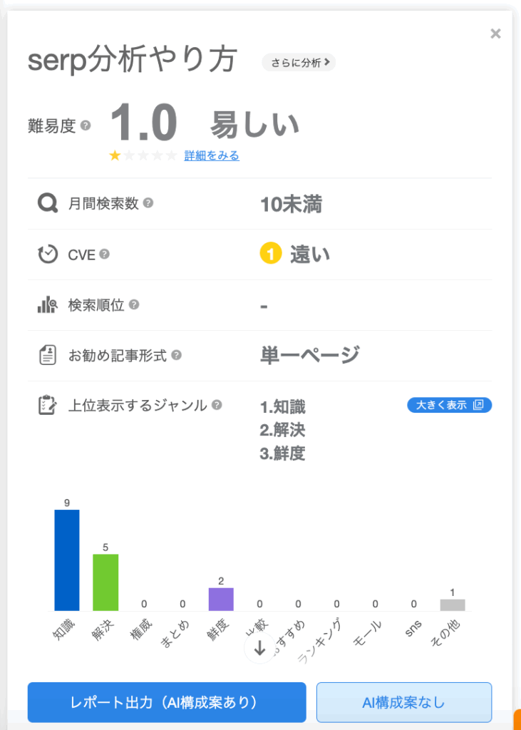 これらが一目でわかるため、上位サイトの構成パターンから外れない記事設計ができます。