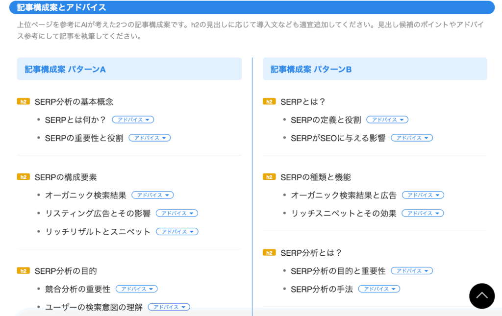 上位サイトの見出し構成を確認できたとしても、そこから自分で構成を考えるのが大変…という場合は、AIが提案する記事構成案(2パターン)も活用できます。