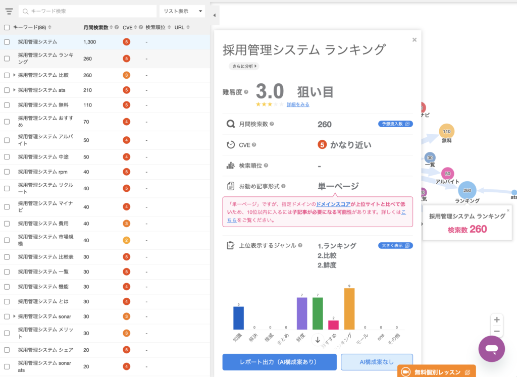 パスカルの「記事作成機能」では、大まかな記事キーワードを入れて、その中の関連キーワードから良さそうなテーマを選んでいます。キーワードの難易度と競合のキーワード状況をチェックし、ビズプラ採用管理(bizpla)が持っている機能と整合性があるかどうかを確認するようにしています。